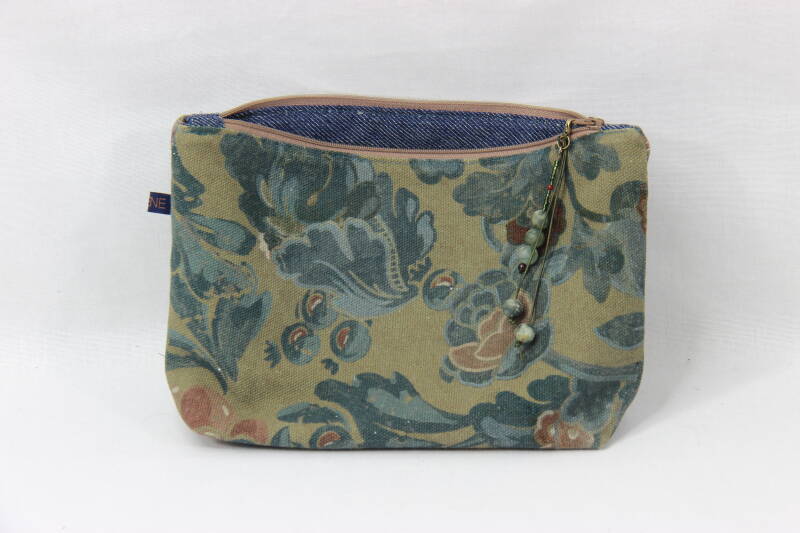 Geprint katoen / linnen jeans pochette. Aan de rits mooi detail met echte natuurlijke steentjes, eveneens handgemaakt in België.