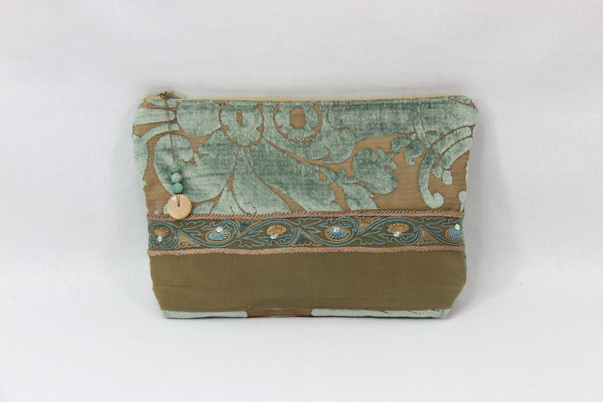 Katoen-polyester jacquard/katoen pochette. Aan de rits bijpassend detail in natuurlijke steentjes, eveneens handgemaakt in België.