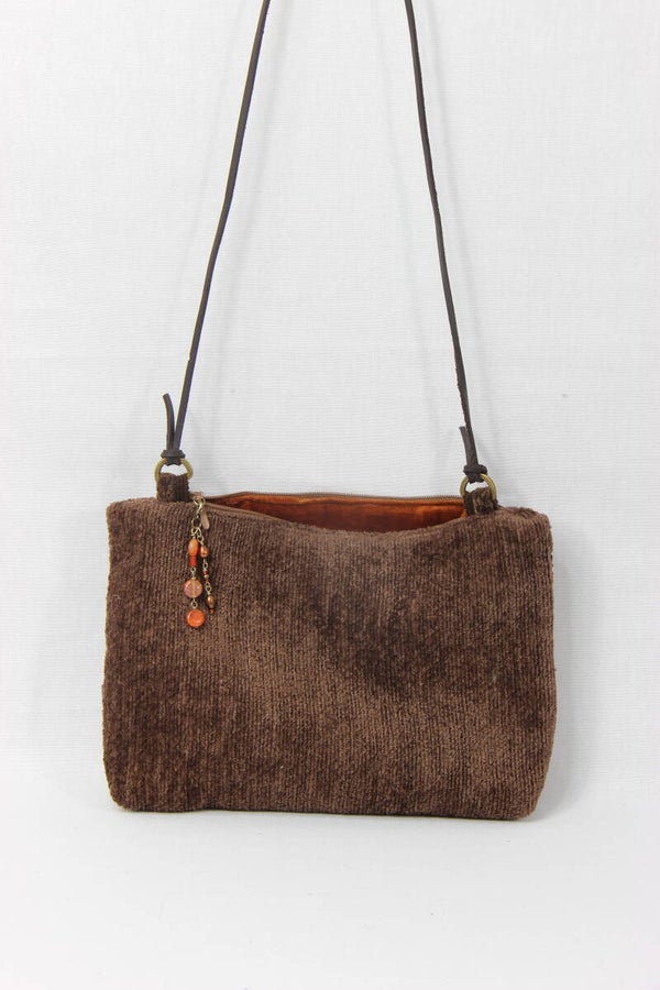 Eye-catcher crossbody tasje in retro onregelmatige velours met fijne handgeborduurde vintage boord. Lederen riempje/koordje, aanpasbaar.